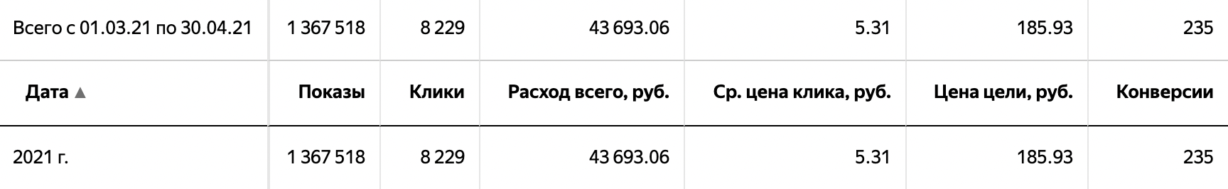 В качестве цели конверсии выбрано действие "Оставлена заявка". За 2 полных месяца израсходовано: 43 693 руб. Средний месяxysq бюджет: 21 846 руб. Средняя цена клика: 5,31 руб. Количество заявок: 235 шт. Средняя стоимость заявки: 185,93 руб.