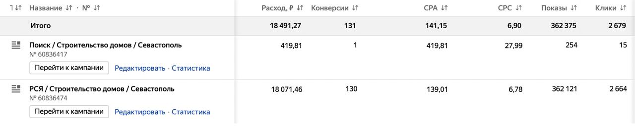 Сфера деятельности — загородное строительство. Ключевые метрики за последние 30 дней: Общий расход за 1 месяц: 18 491 руб. Средняя цена заявки: 141 руб. Заявок: 131 шт.