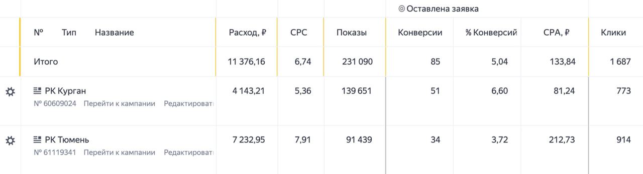 В качестве цели конверсии выбрано действие "Оставлена заявка". За 1 месяц израсходовано: 11 376 руб. Средняя цена клика: 6,74 руб. Количество заявок: 85 шт. Средняя стоимость заявки: 133,84 руб.